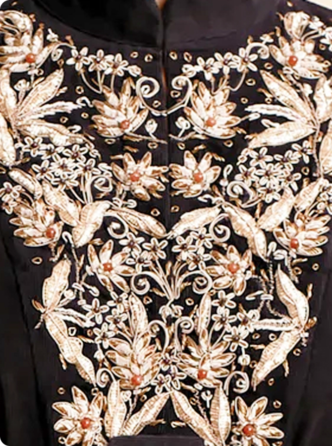 A regal tradition of exquisite threadwork, our embroidery transforms fabric into a canvas of intricate artistry and timeless grandeur.