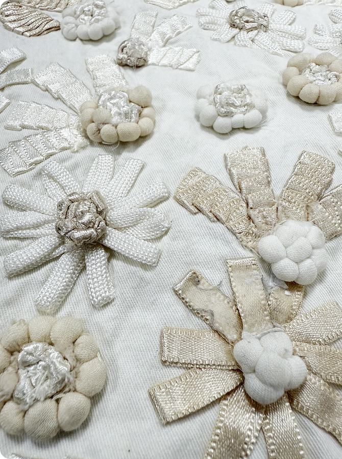 Clusters of delicate knots form elegant textures, adding depth and a refined, princely charm to intricate hand-embroidered creations.