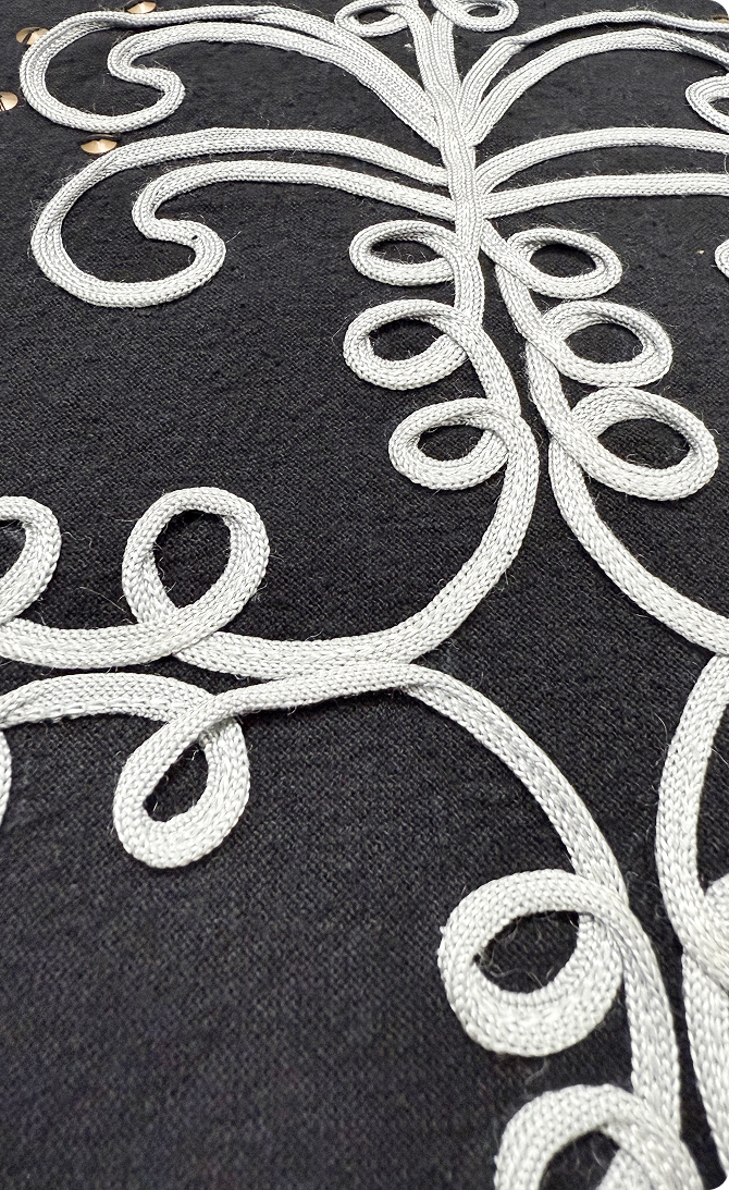 Decorative cords are stitched in sculptural patterns, adding raised detail and bold artistry with each motif becoming a statement of strength and sophistication.